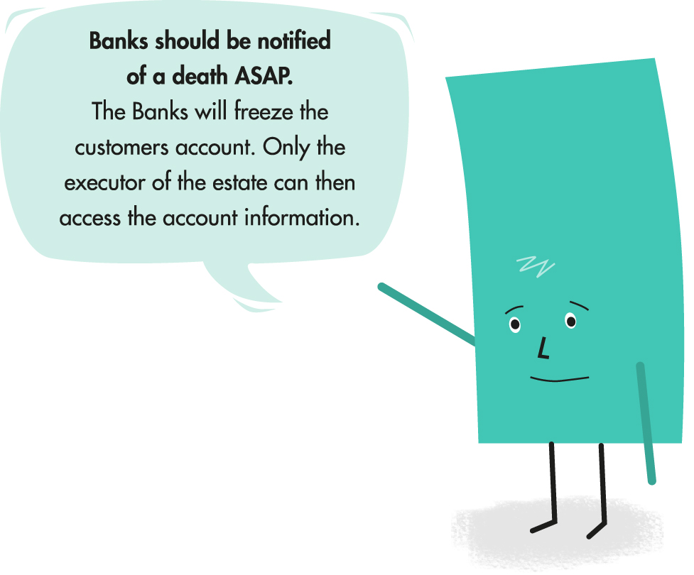 A bank will freeze a deceased customer’s individual accounts when notified of the death. This includes transactional accounts, term deposits, credit cards and loans.