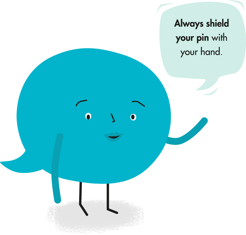 When entering your PIN, shield your hand from view so people around you can't see it. This reduces the chance of somebody "shoulder surfing" your PIN and using your card fraudulently. Some ATMs have built-in security features to protect customers from fraud. You won't be held responsible for fraudulent use of your card as long as you take reasonable care when using an ATM.