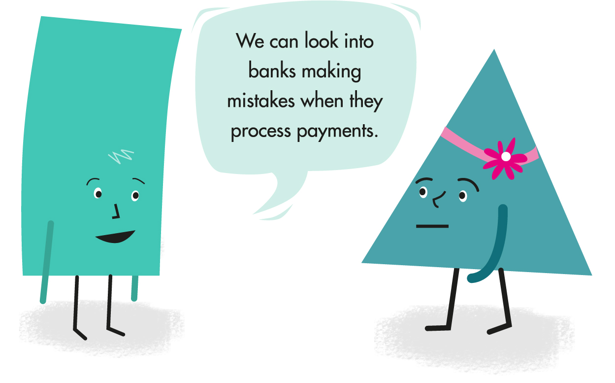 We can consider complaints about banks making mistakes when they process payments. This includes wrongly delaying or failing to make a payment, repeating payments, or giving the wrong information about payments. We don’t have the power to set rules about how banks process payments.